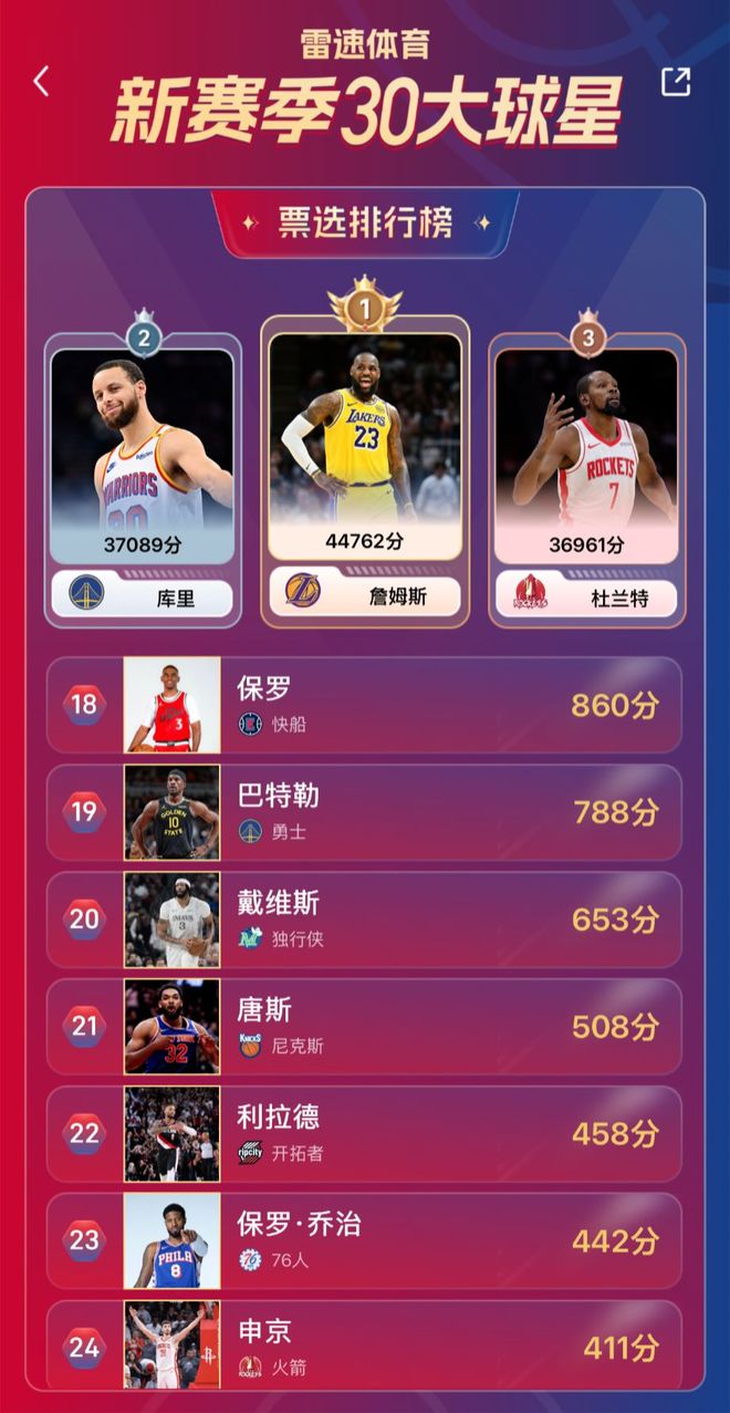 目前雷速NBA新赛季30大球星排名结果如下: